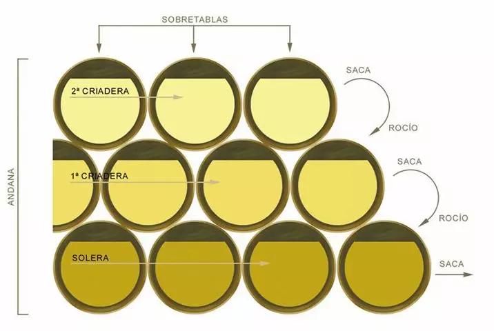自Solera層抽取1/3的酒液(法律規(guī)定,每年抽取量不得超過(guò)Solera層酒液量的1/3)裝瓶,隨后自其上一層(第一培養(yǎng)層1a criaderas)抽取1/3酒液注入Solera層,同理,第一培養(yǎng)層內(nèi)則注入第二培養(yǎng)層(2a criaderas)1/3的酒液……直至每個(gè)酒桶都經(jīng)歷一次抽取并補(bǔ)入酒液的過(guò)程(最上層的Sobretabla層空余部分需用同批次酒液填滿(mǎn))。