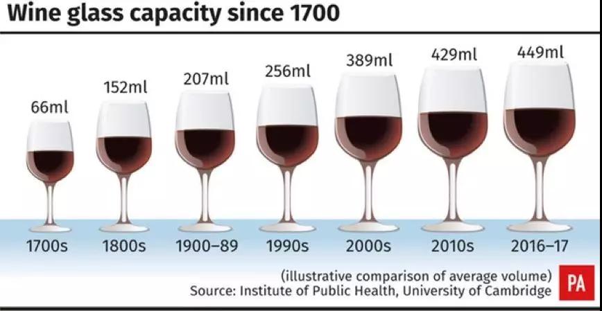 劍橋大學的一項研究發現,在過去300年里,酒杯的容量增加了7倍,而且在最近20年里增幅最大。