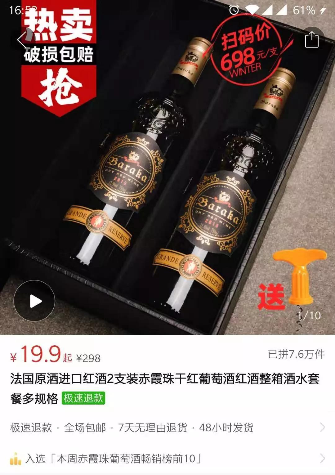 主打“下沉”市場(chǎng)的拼夕夕,“葡萄酒”品類熱銷7.5萬(wàn)件的是19.9元2瓶還送皮盒的灌裝酒。但凡有葡萄酒常識(shí)的消費(fèi)者都能想到,除掉包裝、物流、人工,還能有毛利,得是多么劣質(zhì)的酒液,才能做出不到10塊錢的售價(jià)。
