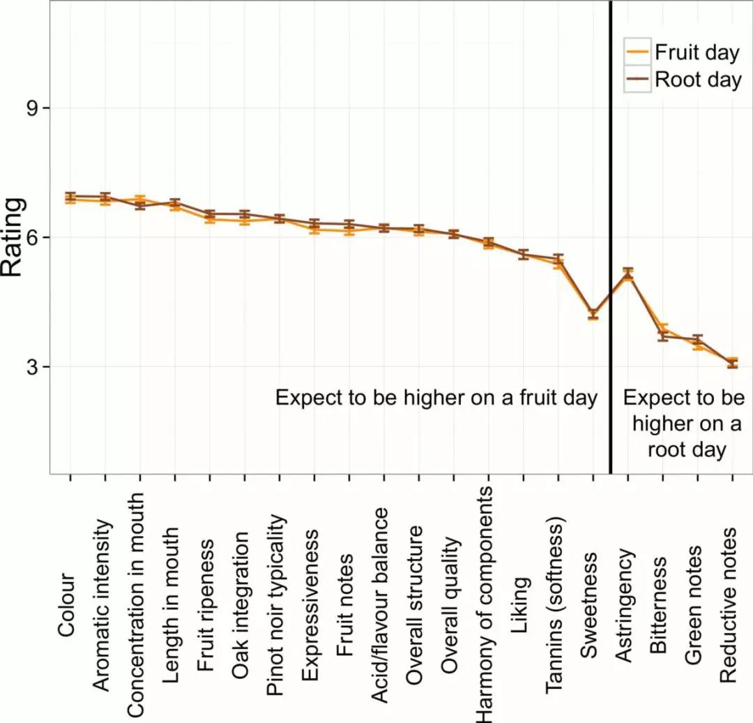 出乎意料的是,實驗顯示:一直以來被認為會對葡萄酒消費者品飲體驗帶來巨大影響和指導意義的日歷,并未對任何一款酒系統性地產生了影響。