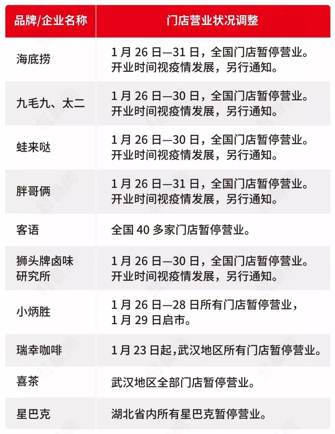 據媒體不完全統計,海底撈、九毛九、太二、蛙來噠、胖哥倆、客語等品牌已經宣布全國門店暫停營業,具體開業時間另行通知。