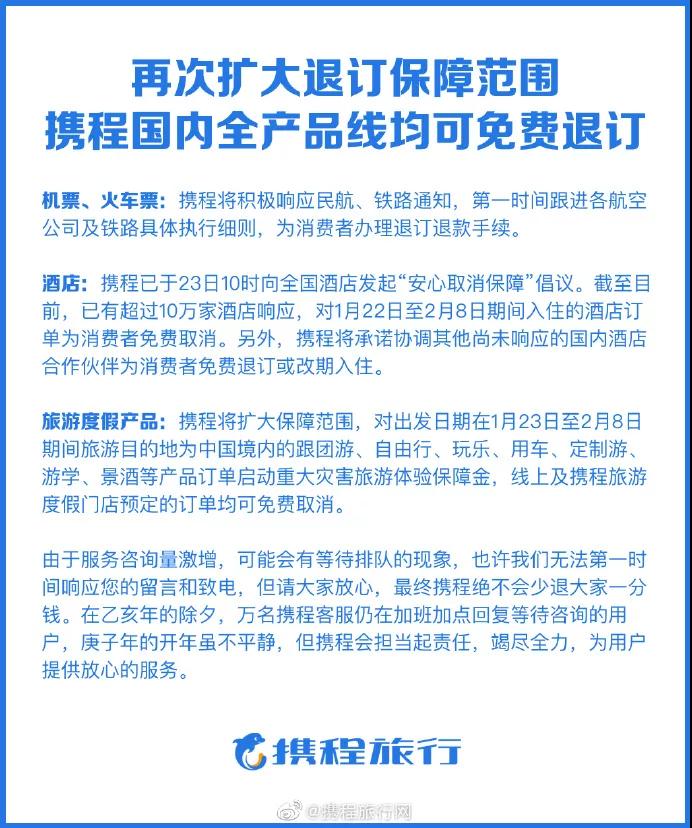 根據攜程1月31日晚間發布的“春運退訂大數據”顯示,疫情發生以來,截至1月30日,攜程客服收到的退改量為數百萬單春節旅游訂單,客戶全球跟團、半自助和定制游的訂單損失負擔至2月29日前。