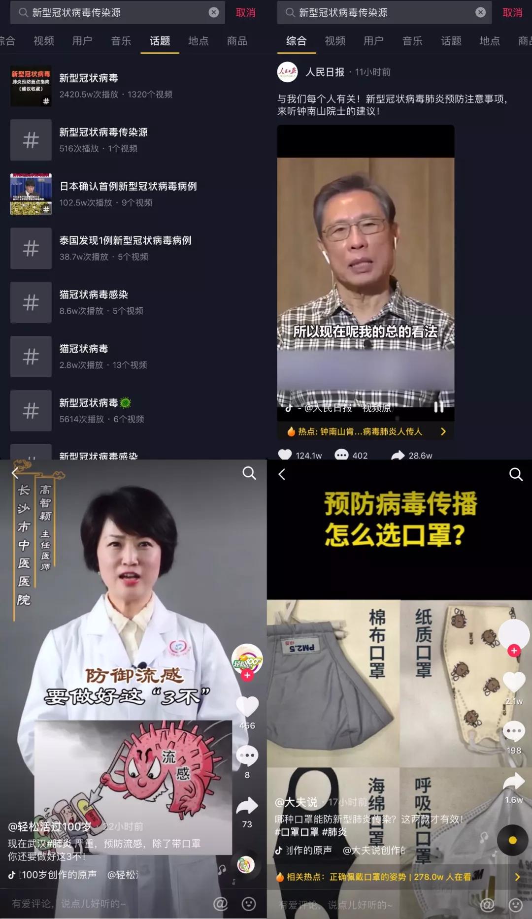 這一次的疫情趕上春節,也正好是各大短視頻平臺火熱營銷的時機,加上春節營銷的一層因素,抖音快手也能在疫情期間,抓住國民注意力流量,展現出作為內容平臺的媒體與社會價值。 在快手抖音的熱搜上,“冠狀病毒肺炎”相關的話題都位列其中,人民日報發布的“鐘南山院士建議”、“習近平重要指示”,央視網發布的“冠狀病毒最新確診病例”等短視頻,播放量都在100萬以上,也都得到用戶極大的關注與討論熱度。