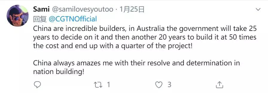 “中國真是令人難以置信的建設者,在澳大利亞,政府需要25年時間來做出決定,然后再用20年時間來建造,成本會是50倍,且最后僅以項目的四分之一完工!中國在國家建設方面的決心和果斷總是讓我吃驚!”