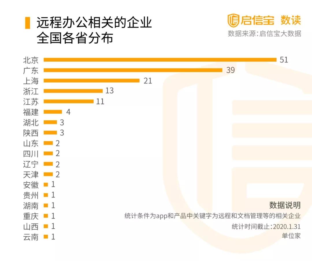 根據啟信寶數據統計,全國共有159家有遠程辦公的企業,其中北京、廣東、上海分別數量為前三,可能受益會相對較大。