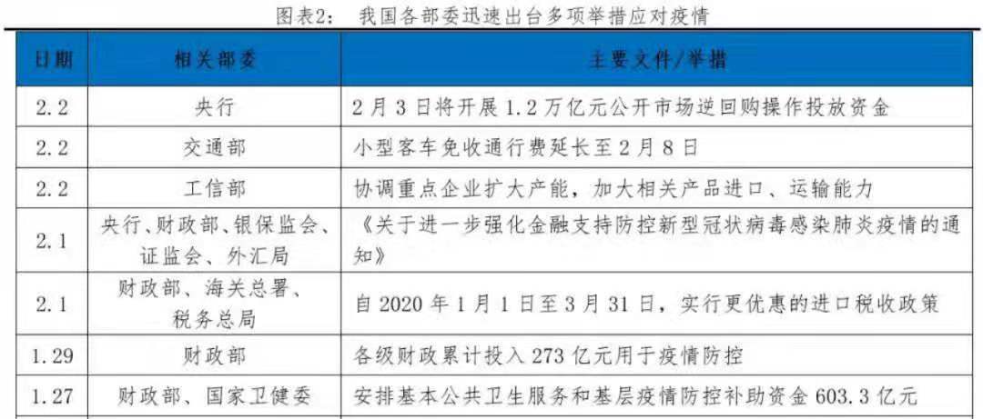 疫情發(fā)生后,央行、財(cái)政部、證監(jiān)會(huì)等多部委快速出臺(tái)應(yīng)對(duì)方案,釋放穩(wěn)定預(yù)期信號(hào),對(duì)沖疫情影響,為受疫情影響的地區(qū)、行業(yè)、企業(yè)提供信貸支持,保證企業(yè)資金鏈、現(xiàn)金流的接續(xù),提振市場信心,維護(hù)市場穩(wěn)定。