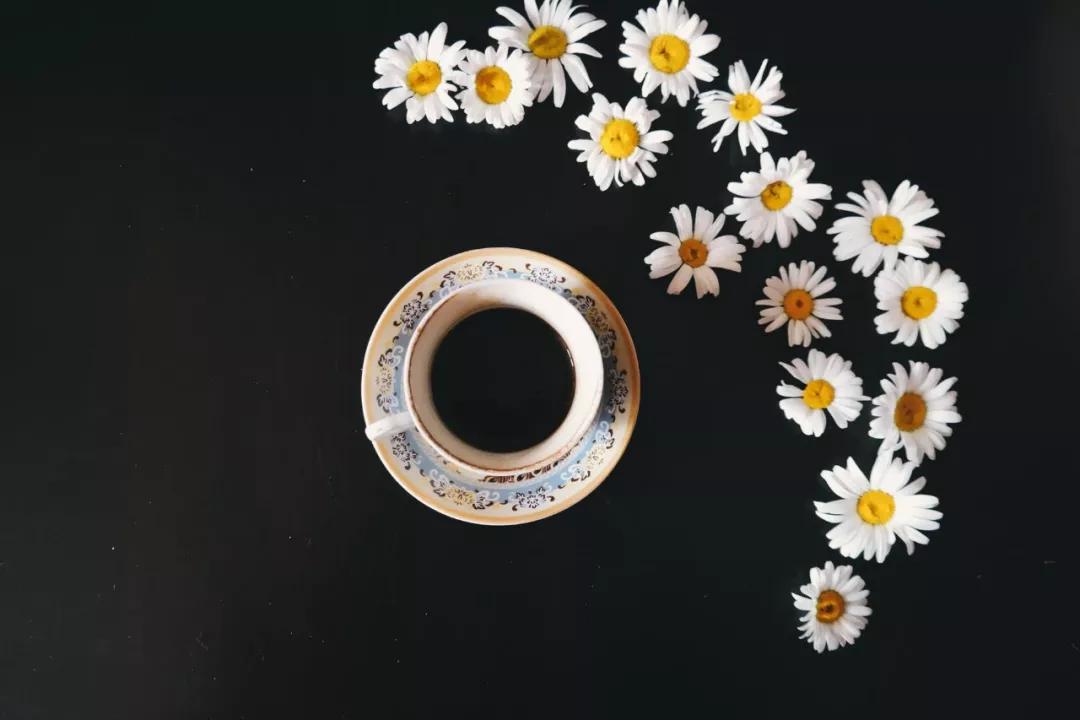第3個思路,可以利用茶杯或者咖啡,跟花做一個擺設,用高角度,從上往下拍攝,這種拍攝手法,跟美食的拍攝手法差不多,唯一要注意的就是在用光的時候一定要注意,光線要柔和不要太硬,從上往下拍呢,要注意這個角度要相對垂直。