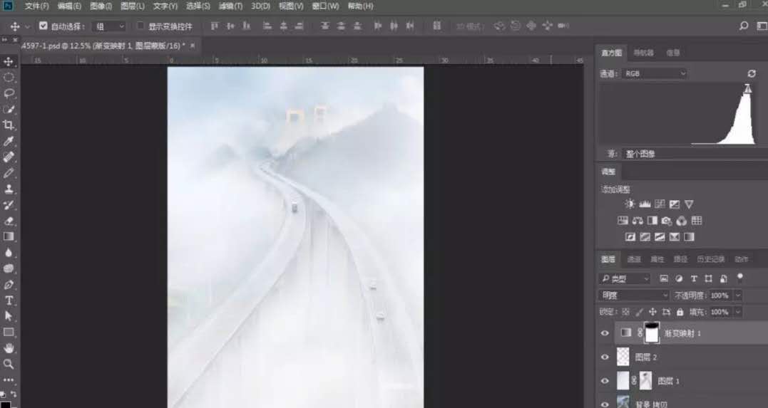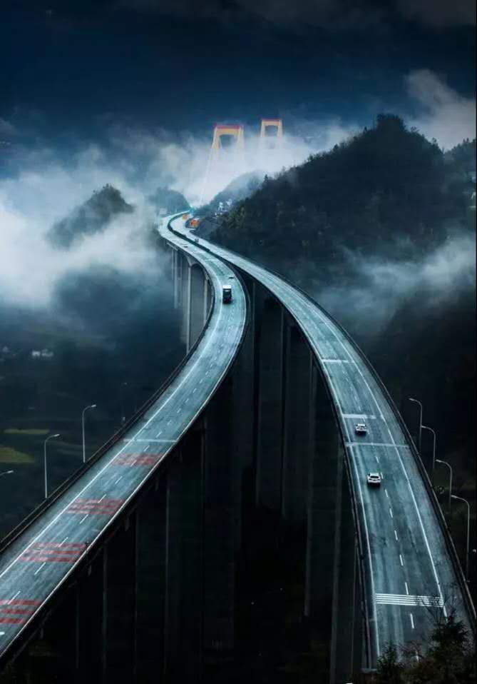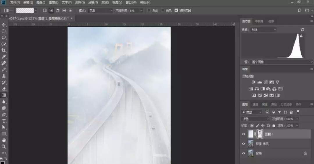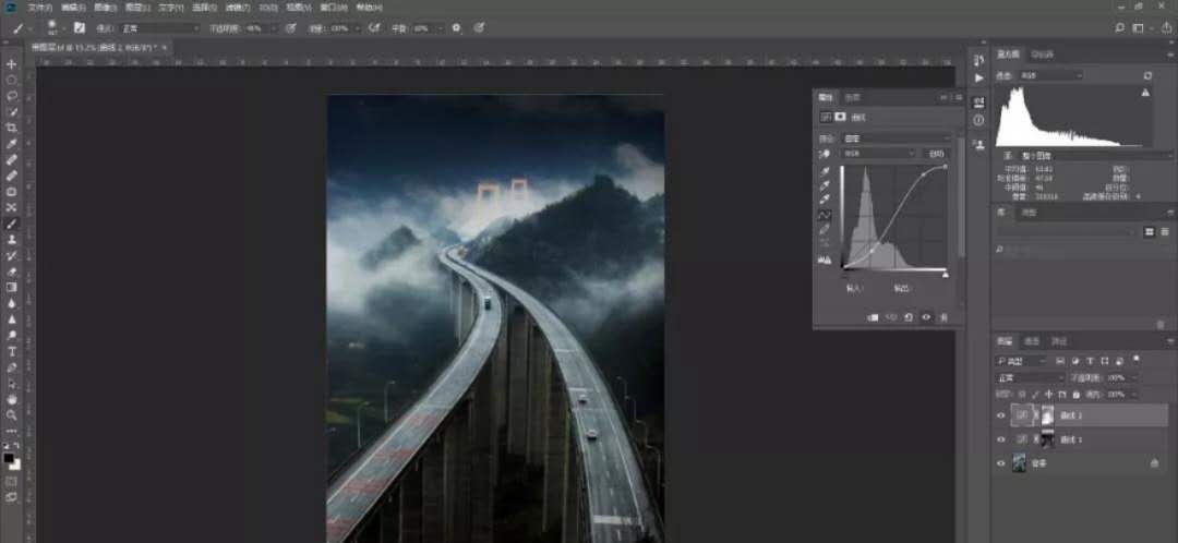 對原圖作適當的裁剪,使畫面更加簡潔。用矩形套索工具選取部分云霧,通過自由變換覆蓋整個畫面,選擇濾鏡-模糊-高斯模糊,對新圖層進行模糊處理,使云霧更自然,選擇圖層混合模式為濾色,并為該圖層建立蒙版,點擊“漸變工具”,選擇從前景色黑到背景色白的漸變,再選擇“徑向漸變”,前景色為黑色,用不透明度8%左右,編輯蒙板,擦出高架橋的部分,最后對該蒙版作適當的羽化。