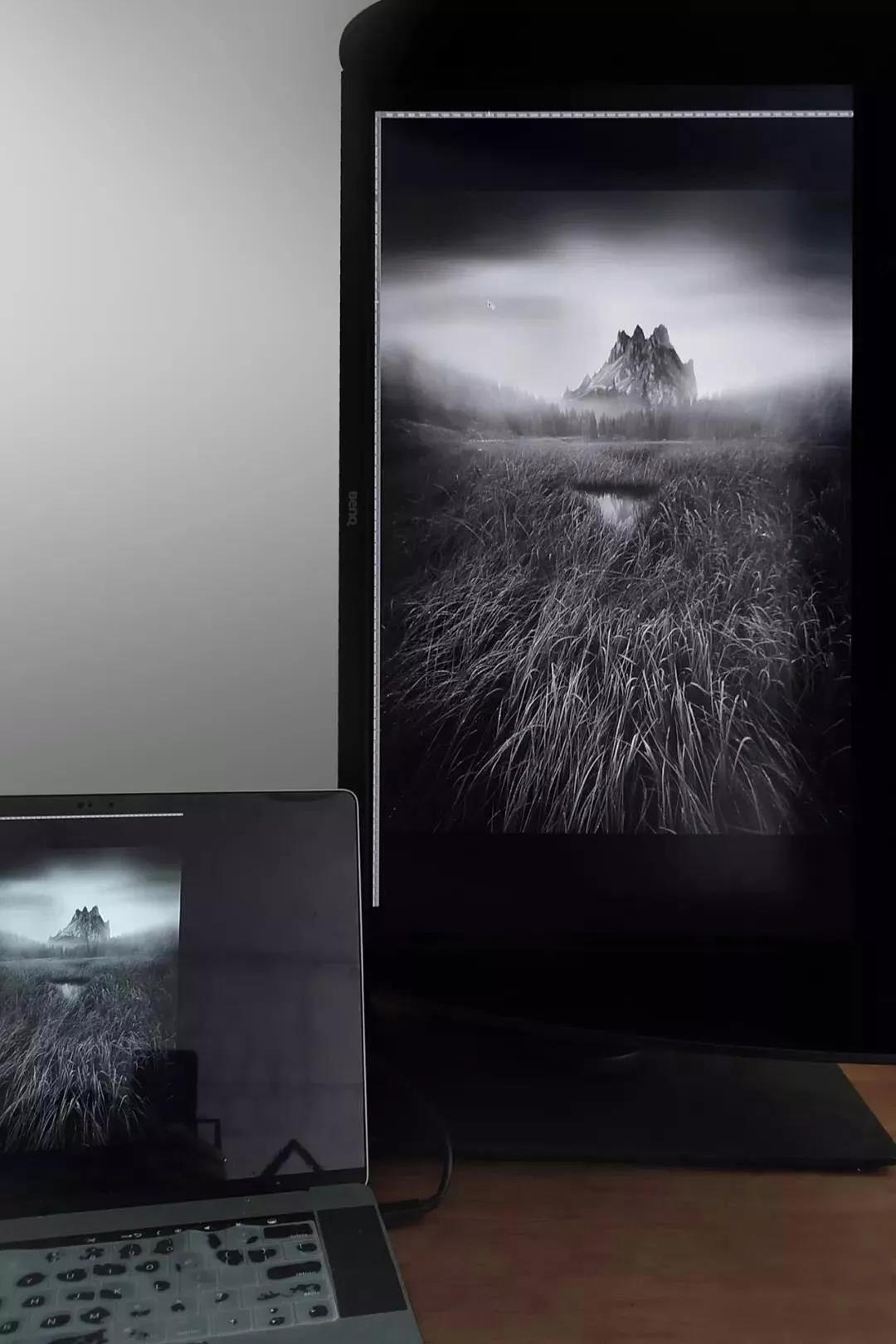 另外,明基SW270C還配有不同顯示模式協助修圖,例如很多人像攝影師非常偏愛的黑白模式,可以直接將屏幕調整黑白調節光影,免去新建圖層等繁瑣操作。