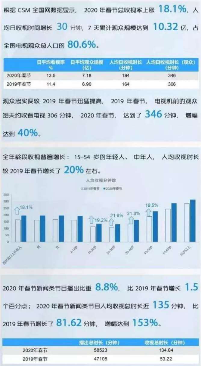 足不出戶、居家過年成為2020年全國人民的春節度假模式,電視再次彰顯出強者的力量。觀眾忠實度較2019年春節迅猛提高,2019年春節,電視機前的觀眾每天約收看電視306分鐘,2020年春節,達到了346分鐘,增幅達到40%。