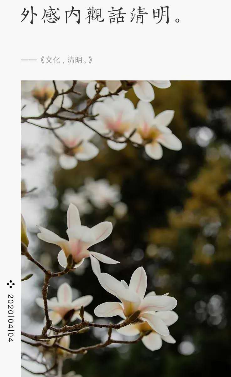清明,我們又一次進入化文的狀態。細雨紛紛,煙柳垂淚,行人斷魂,是對逝者的緬懷和尊敬;萬物生長,惠風和暢,天清地明,是對生者的祝福和期待;萬物有靈,春發幾枝,懵懂初醒,是對靈者的啟示和生發……