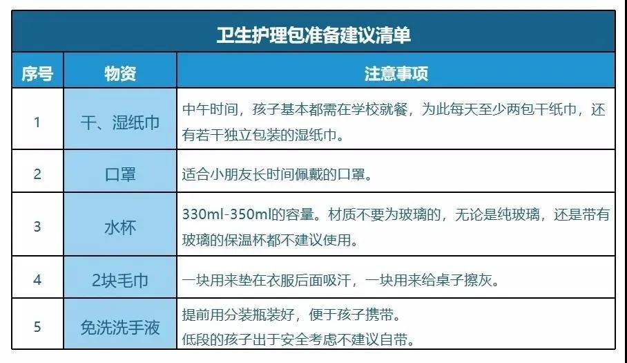 除了學(xué)具的準備外,家長可以跟孩子做好疫情期間的抗疫物品準備。比如,可以準備個衛(wèi)生護理包,護理包里準備兩個口罩,一些濕紙巾,兩包干紙巾,條件允許的話還可以準備免洗的洗手液或者消毒液,或者一次性的小方巾。