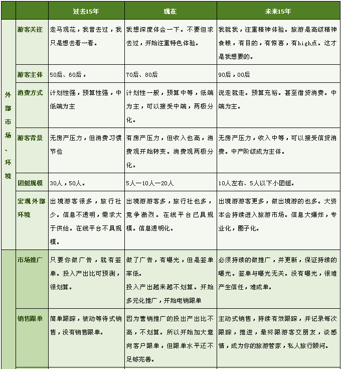 請看以下的分析,從外部環境,游客主體,產品趨勢,等幾個方面,綜合對比過去十五年,現在,和未來十五年的一個變化和趨勢。