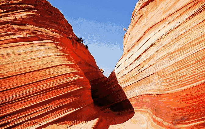 美西和陜北波浪谷,都是古老的沙丘隨著平原的上升,加上漫長的風蝕,水蝕,峽谷里砂巖的層次逐漸清晰地呈現出來。平滑的,雕塑感的砂巖和巖石上流暢的紋路創造了一種令人目眩的三維立體效果。二者也有一定區別,美西波浪谷在紅色之間夾有白色線條,紅白相間;而陜北波浪谷則以紅色為主。