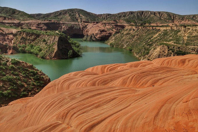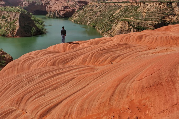 波浪谷景區位于陜西省靖邊縣城東南22公里處的龍洲鎮,是典型的盆地型峽谷,這里紅巖環繞,綠水縈繞,方圓百公里都被紅色砂巖所覆蓋,與美國亞利桑那州的波浪谷非常相似, 亞利桑那州波浪谷紅色之間夾有白色線條, 靖邊波浪谷則以紅色為主。