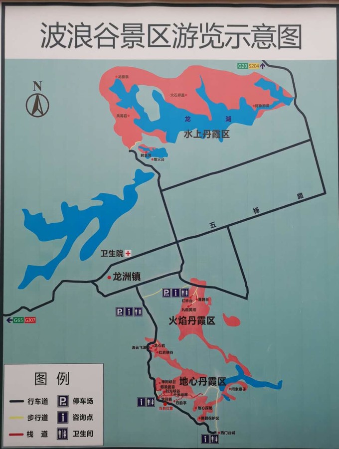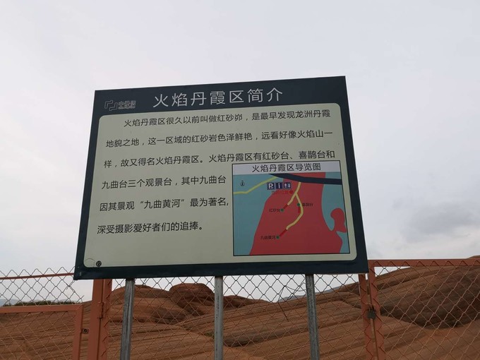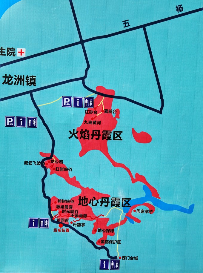 景區是很大一片區域,分為水上丹霞區、火焰丹霞區、地心丹霞區三個部分。路標指示不明確,只有“水上丹霞區”和“火焰丹霞區”兩個地方的標識,具體需要自行找路。根據當地人介紹,整個景區有1、2、3、4、5號五個景點,1至4號可以自行開車游覽,5號由于路況不好并且有十多公里路遠,需要花200元左右請當地人帶路才能前往下圖是現場拍的景區示意圖,能很清晰的看出景區分布,供大家參考。