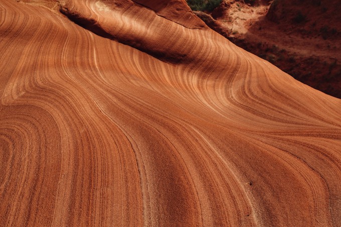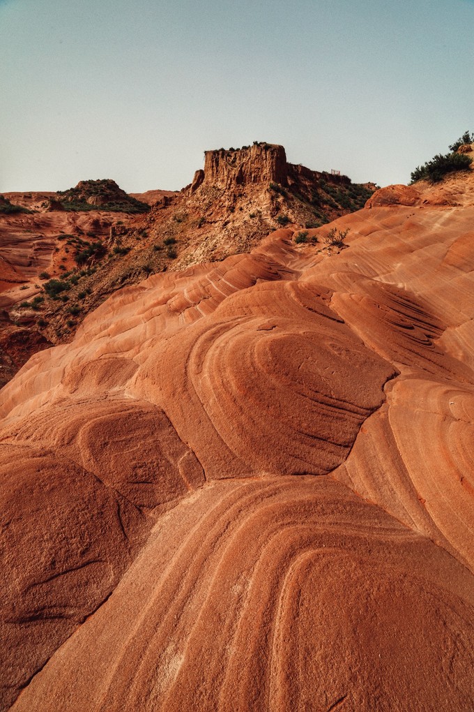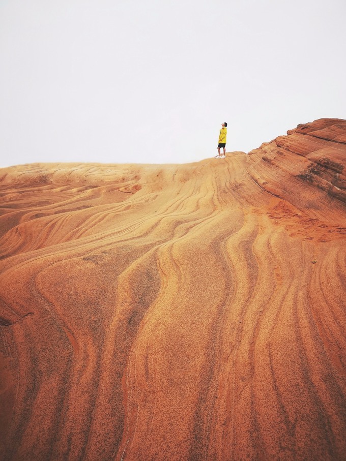 龍洲丹霞B景區,目前命名火焰丹霞,也是最類似美西波浪谷的地方,這里向我們展示了由數百萬年的風、水和時間雕琢砂巖而成的奇妙世界。深深的溝壑里,千百年雨水沖刷成各種各樣奇特的線條,形狀如波浪、獸首、流水、云朵....展示著風采神韻、萬千姿態、四季景色各異。
