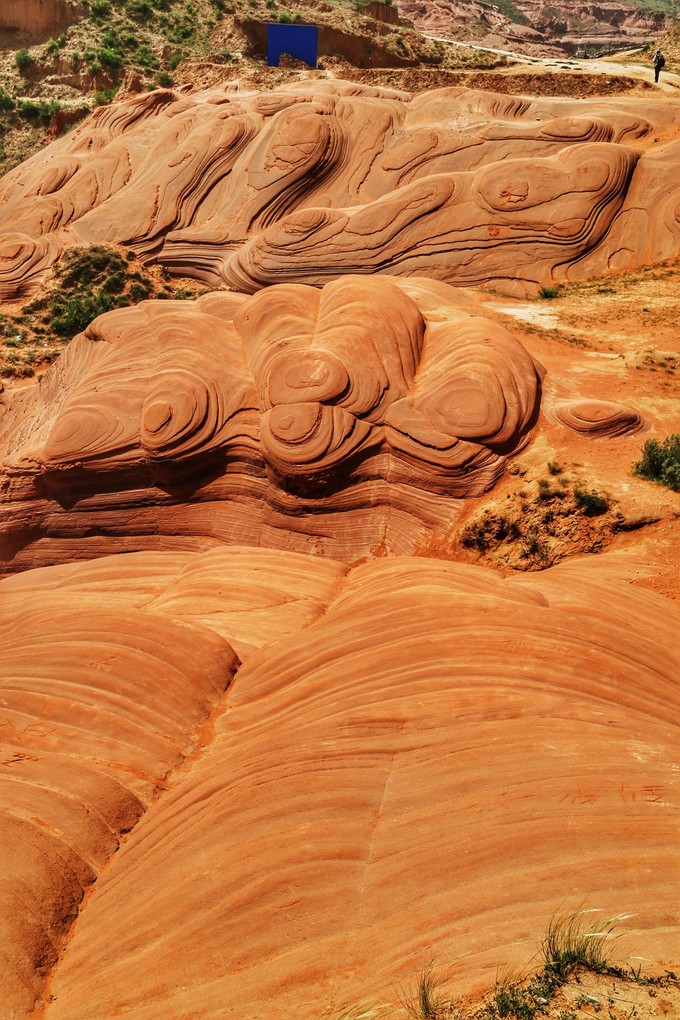 這片區域目前還沒有圍欄,可以直接走到砂巖上去。敬請各位游客文明游覽,不要再往巖壁上刻到此一游的字樣了,好好的自然景觀都這樣被毀了,長此以往丹霞地貌就只可遠觀不可近玩了。