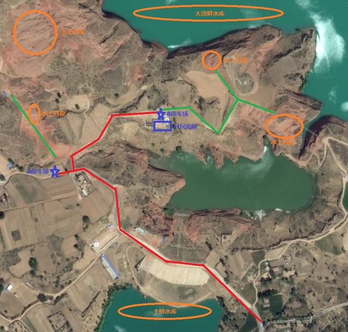 在龍州鎮北邊有幾處明顯的“水上丹霞”指示牌指向水上丹霞,過土橋水庫向前幾百米,A停車場就在路邊,停車前行就可以看見被圍欄圍起來的一片丹霞。B停車場設在當地一戶農民的院內,右手有一個農民自己修建的岔路,進去一兩百米就是了。