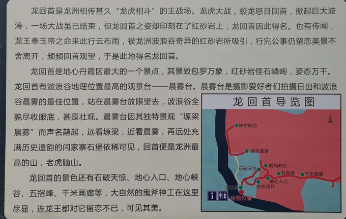 到達龍洲丹霞區域,導航不再起作用,主要靠當地路旁的路牌指引。