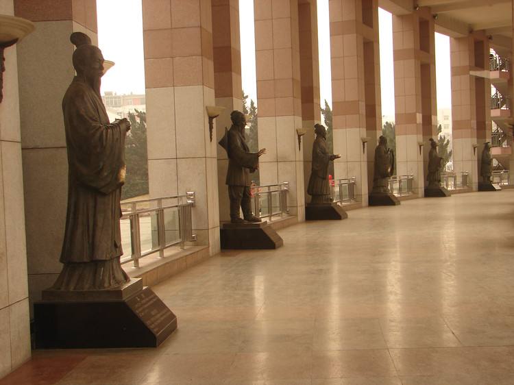 文化長廊位于泉城廣場東側(cè),是泉城廣場東部重要標志性建筑物,也是登高欣賞廣場全貌的最佳場所。文化長廊呈圓弧狀,南北長150米,高16米,分三層。墻身嵌以中國傳統(tǒng)柱式造型,體現(xiàn)了傳統(tǒng)文化內(nèi)涵。長廊內(nèi)設(shè)大舜、管仲、孔丘、孫武、墨翟、孟軻、諸葛亮、王羲之、賈思勰、李清照、戚繼光、蒲松齡12尊歷史名人雕塑,鑲嵌在長廊南北兩端及西立面柱基上的14幅浮雕有東方曙光、舜耕歷山、伯禽治魯、太公封齊、管仲霸齊、晏嬰諫君、孔子講學、子貢貨殖、孫武兵法、稷下爭鳴、孟子游說、魯班學藝、扁鵲行醫(yī)、鄒衍辯論。這組浮雕命名為《圣賢史跡圖》。