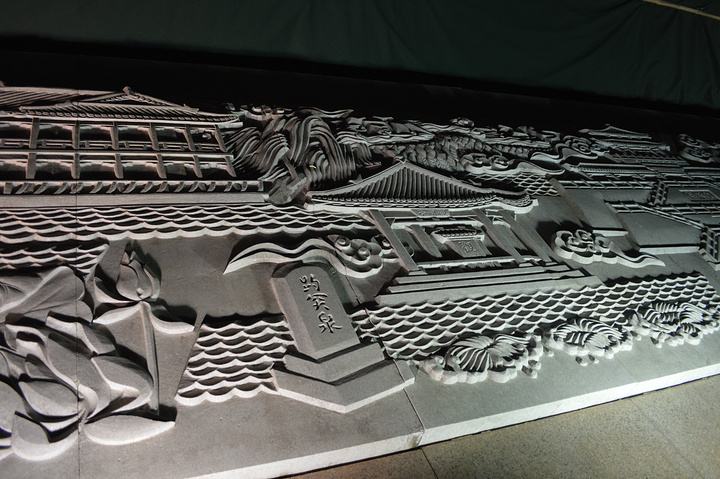 《泉城攬勝》浮雕位于廣場中部、下沉廣場東側(cè),長30米,寬2.5米,選自珍珠白花崗石雕刻而成。浮雕以多場面組合的構(gòu)成手法,將泉城“三大名勝”、“四大泉系”、“齊煙九點”、“靈巖圣境”、“四門古塔”、“龍山文化”等景觀和文脈融為一體,充分體現(xiàn)了“山、泉、湖、城、河”泉城特色,展示了泉城濟南豐富多彩、古老莊重的文化風貌。