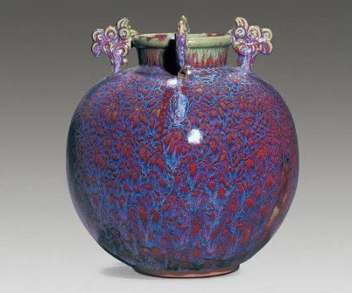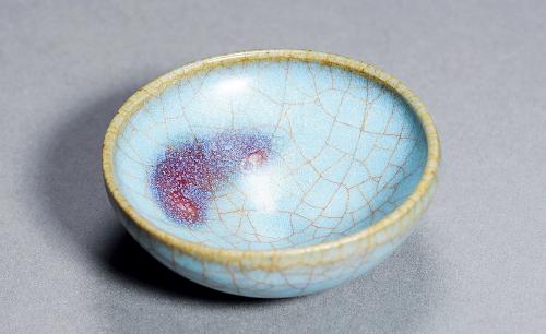 鈞釉的紅色是由于還原銅的呈色作用。紅釉中含有0.1~0.3%的CuO(氧化銅),還含有一定數量的 SnO2(二氧化錫)。在天藍、天青和月白色釉中,CuO含量極低,只有0.001~0.002%,和一般白釉中的含量相近,鈞釉的紫色是由于紅釉與藍釉互相熔合的結果,鈞瓷的紫斑是由于在青藍色的釉上有意涂上一層銅紅釉所造成的。
