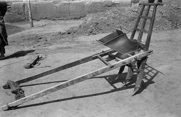 簍。由牲畜牽引,后面有人把扶,用來完成開溝和播種兩項(xiàng)工作,這種農(nóng)具在東北使用比較普遍,它也是現(xiàn)代播種機(jī)的前身