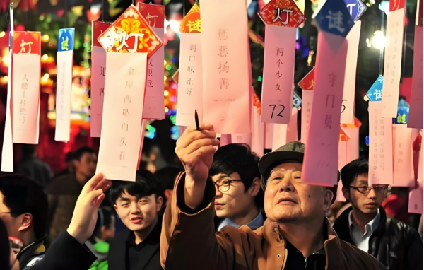 燈謎在春秋時代就有,那時叫“隱語”,到漢魏時才開始稱為“謎”,南宋時有人將謎語寫在燈上,在上元節讓人猜燈謎。南宋后,賞花燈、猜燈謎讓元宵節的氣氛熱鬧而溫馨。由于燈謎都難以猜中,如同老虎難以被射中一樣,所以也稱為“燈虎”(也叫文虎)。傳統燈謎的制作講求一定的格式,需運用巧思才可以制出十分高妙的燈謎,是中國獨創的文學藝術。