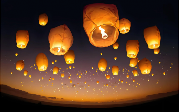 “放天燈”,來由是過去人們在躲避盜匪侵襲而四散逃逸之后,以燃放天燈為互報平安的信號。由于避難回家的日子正是元宵節,從此以后,每年這一天,人們便以放天燈的儀式來慶祝,所以又稱天燈為“祈福燈”或“平安燈”。其后逐漸演變為向上天祈福許愿的民俗活動。天燈上寫滿了心里的各種祈愿,希望天燈能上達天庭,帶給人無限的希望和光明。