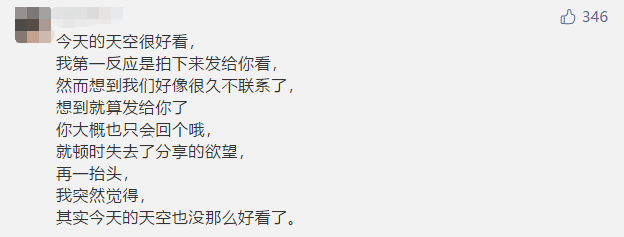 可他看到消息,選擇了視而不見(jiàn)。在你仍舊等待,翹首以盼會(huì)收到回復(fù)時(shí)。他早就把你當(dāng)作無(wú)關(guān)緊要的事,拋到九霄云后。等到突然想起來(lái)的時(shí)候,就回一個(gè)“嗯”。可你卻發(fā)現(xiàn)他的狀態(tài)欄,更換了好幾次。一起聚餐喝酒,別人都帶上愛(ài)人,唯獨(dú)他不帶你。