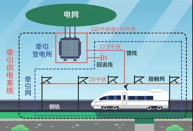 另外,高鐵用電和家庭用電不同。家庭用電的電壓等級(jí)一般是220伏,而高鐵用電雖同為單相電壓,但電壓等級(jí)卻高達(dá)25(27.5)千伏。這種單相、25(27.5)千伏的交流電是由牽引變電所將電網(wǎng)輸?shù)碾娹D(zhuǎn)變而來(lái)。
