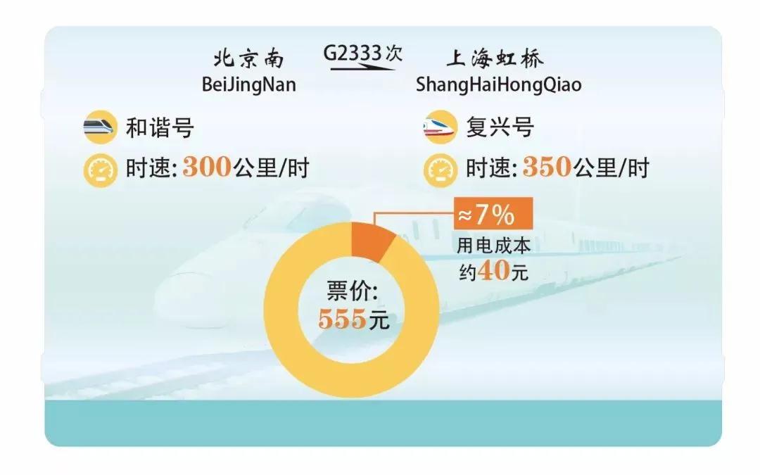 我們來(lái)看個(gè)實(shí)例。以京滬高鐵為例,據(jù)新華社報(bào)道,和諧號(hào)動(dòng)車(chē)組時(shí)速300公里時(shí),人均百公里耗電量為3.64度、單趟全程總耗電量約48度。據(jù)《科技日?qǐng)?bào)》報(bào)道,時(shí)速350公里運(yùn)行的復(fù)興號(hào)動(dòng)車(chē)組人均百公里能耗僅3.8度電,單趟全程總耗電量約50度。按照目前高鐵享受的優(yōu)惠電價(jià)算,用電成本約40元,為京滬高鐵全程二等座票價(jià)555元的7%左右。
