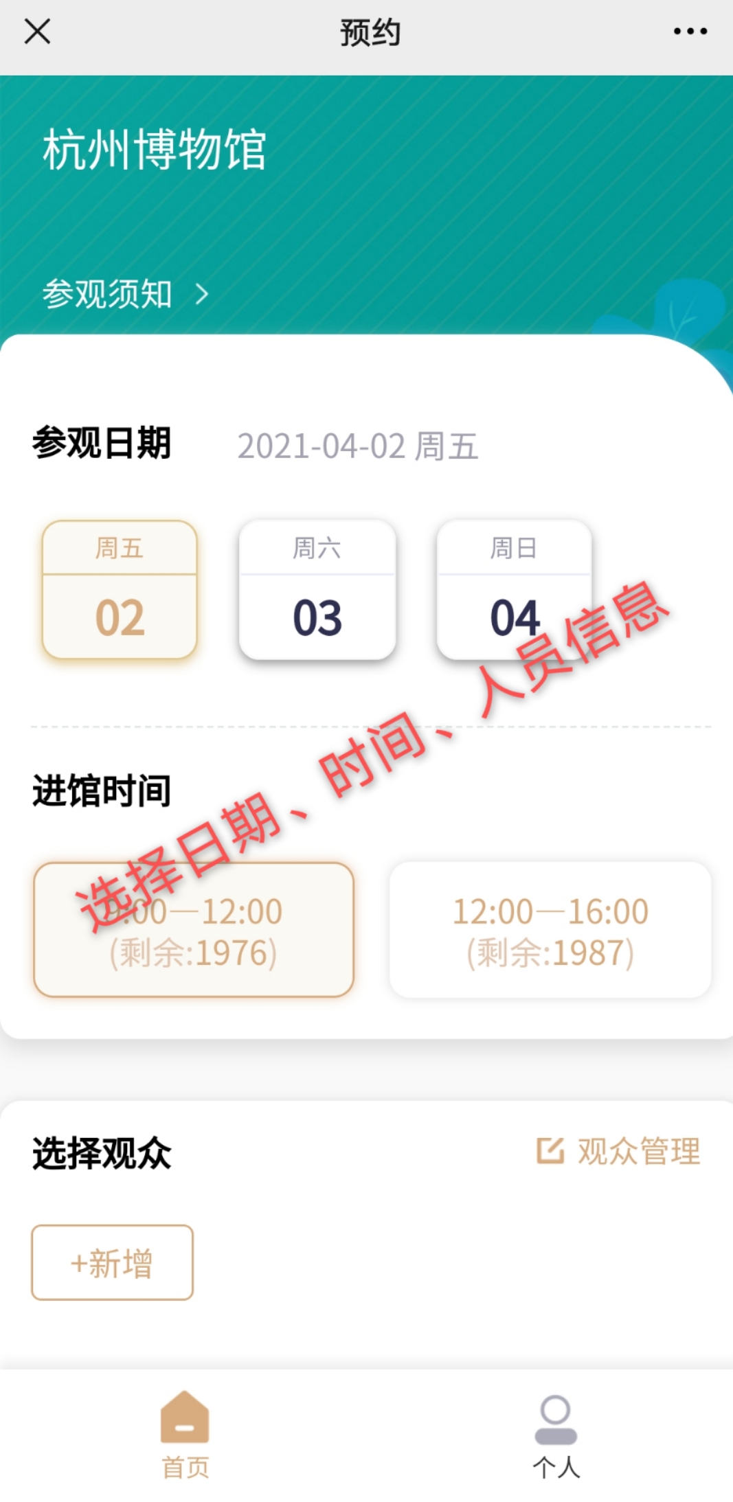 2. 每張有效身份證件每個時段限約1次,每次可預約5人。請務必截屏保存預約二維碼(也可通過微信預約界面進入個人->我的預約->查看獲取預約二維碼 )。觀眾到館后通過刷二維碼或預約的身份證過閘檢票進館。