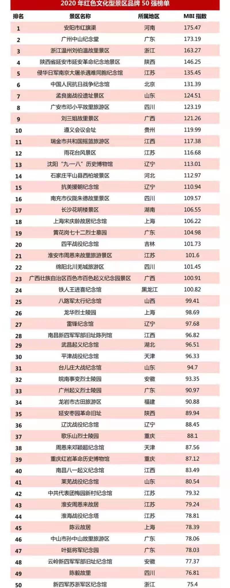 以下是「我們」獨家發布的“2020年紅色文化型景區品牌50強榜單”,其中安陽市紅旗渠、廣州中山紀念堂、浙江溫州劉伯溫故里景區位列年度三甲。