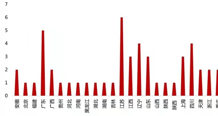 經「我們」監測,Top50榜單中,4A級景區占據絕對優勢,5A 級景區僅占比26%。年度排行榜數據顯示,2020年江蘇上榜6家,整體數量最多,區域內紅色文化型景區品牌影響力最大。