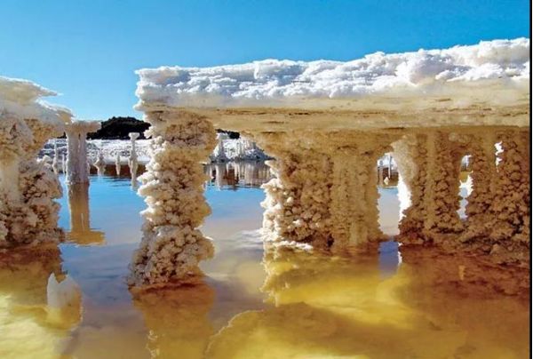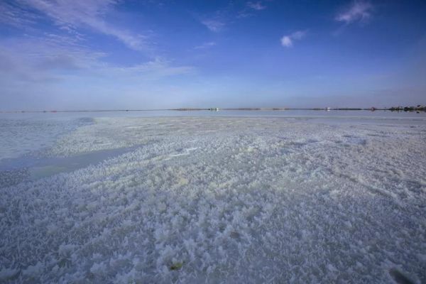 這些鹽花無需人工的雕琢,形態各異,有的宛如貝殼,有的宛如樓臺,一叢叢,一片片,一簇簇地立于鹽湖中,把鹽湖裝飾得如仙境一般。