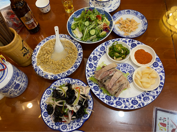 游覽結(jié)束,回到天水市區(qū)入住。想吃當(dāng)?shù)靥厣业搅恕袄霞野舜笸搿苯鉀Q晚飯,非常滿意,手抓羊肉、甜胚子、大拌菜,有滋有味。此時還不知道接下來面臨什么樣的美食荒漠。當(dāng)?shù)氐臋烟乙脖容^有名便宜,路上買了一點(diǎn)。