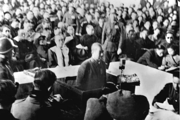 這是抗日戰(zhàn)爭勝利后,制造南京大屠殺的主要罪犯、日軍第6師團師團長谷壽夫被押上審判臺并被處死刑。