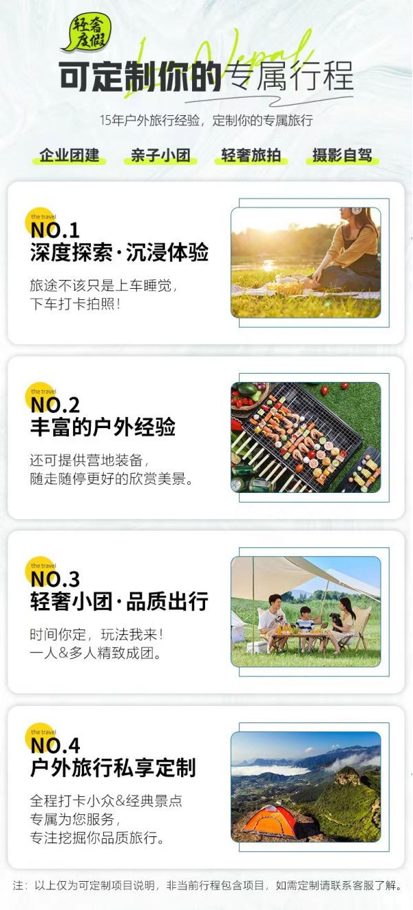 私人訂制:我們業(yè)務(wù)范圍囊括了全國各大城市,川西、西北、西藏、新疆,在路上永遠(yuǎn)有我們的身影。我們將為每一個(gè)有定制需求的你策劃出獨(dú)屬于自己的完美旅行。