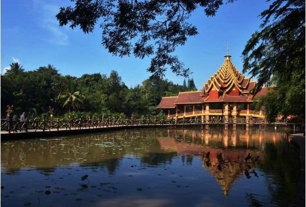 早餐:酒店早餐 中餐:孔雀宴 晚餐:自理早餐后,乘車抵達扶貧旅游示范村,參觀【傣族文化村落】(游覽時間約180分鐘),是西雙版納唯一集中展示傣族歷史、文化、宗教、體育、建筑、生活習俗、服飾、飲食、生產生活等為一體的民俗生態旅游精品景區。幢幢精巧別致的傣家竹樓和佛寺古塔掩映在綠樹叢中,透著一種自然、純樸、寧靜。這里江湖環抱、綠樹掩映,花果飄香,梵音繚繞,給人一種神秘,祥和的感受。在這里人與人、人與自然和諧相處 , 這是傣家人的勐巴拉納西,傣家人的人間天堂.大家可以體驗濃郁的傣家生活習俗, 觀賞典型的干欄式建筑、傳統的手工藝制作、傣族民間歌舞,以及接觸到神秘的小乘佛教文化。后前往游覽【勐泐大佛寺】(游覽時間約 120 分鐘,電瓶車自理單程 40 元/人、往返 60/人,建議乘坐單程)。國家AAAA級景區,也是傣王故宮遺址的重要部分,勐泐大佛寺是在古代傣王朝的皇家寺院"景飄佛寺"的原址上恢復重建的,"景飄佛寺"是傣族歷史上一位名叫撥龍的傣王為紀念病故的王妃南紗維扁而修建,從萬佛塔前廣場俯視景洪市景,旖旎的熱帶風光盡收眼底,景區以弘揚“南傳佛教文化”為中心,也可參與傣家潑水狂歡活動,與雨林精靈——孔雀親切互動,看孔雀齊飛盛景、明鏡臺-玻璃棧道 由景區山頂向景洪市區方向延伸,是跨度長45米,寬度24米,總面積約800m的懸空玻璃觀景平臺,取偈語“身是菩提樹,心如明鏡臺”,打造“明鏡菩提”的獨特意境。