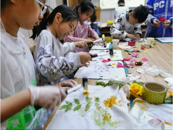 扎染和拓染是我國民間特有的印染技術(shù),是非物質(zhì)文化遺產(chǎn),其工藝從扎到染、從拓到染都具有豐富的創(chuàng)造性。首先,老師以故事的形式講解了扎染的由來及制作過程,同學(xué)們都躍躍欲試。但是在扎繩子的時候同學(xué)們卻犯了難,不知道怎么樣扎出自己想要的圖案。通過老師講解、示范,同學(xué)們有了思路,經(jīng)過自己的探索,扎出了各種形狀,涂染上不同的顏料;拓染活動又引爆了同學(xué)們的興奮點,同學(xué)們揮動著錘頭,敲打著早已經(jīng)準(zhǔn)備好的花草,期待著完成后的驚喜。