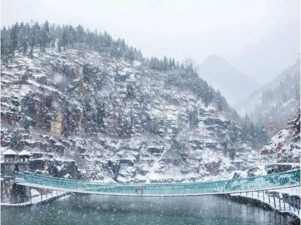 冬日落雪,一夜成畫。雪后的潭溪山,無論是山間小路還是蜿蜒遠山,都呈現出純凈浪漫的畫卷,在藍天的映襯下,山間仿佛更加雪白,陽光的照耀下冰瀑更顯晶瑩剔透,不由得讓人感嘆大自然的鬼斧神工。