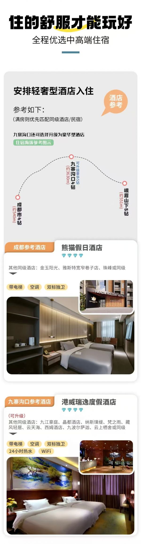 贈送:九寨溝景區旅拍2張精修+底片全送(電子版)、峨眉山溫泉體驗、川劇變臉表演晚會、專業旅游意外險(不含財產險)、2人以上24H成都雙流機場接機/成都市區車站接站