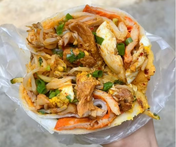傳統小吃,堪稱當地街頭美食的“扛把子” 。它以一張薄如宣紙、韌性十足的大面皮為“畫布”,包裹起豆芽、黃瓜絲、面筋等清爽素菜,再根據喜好加入鹵蛋、香腸、鹵肉等葷料,最后淋上秘制蒜汁、辣椒油等調料,一卷成型。