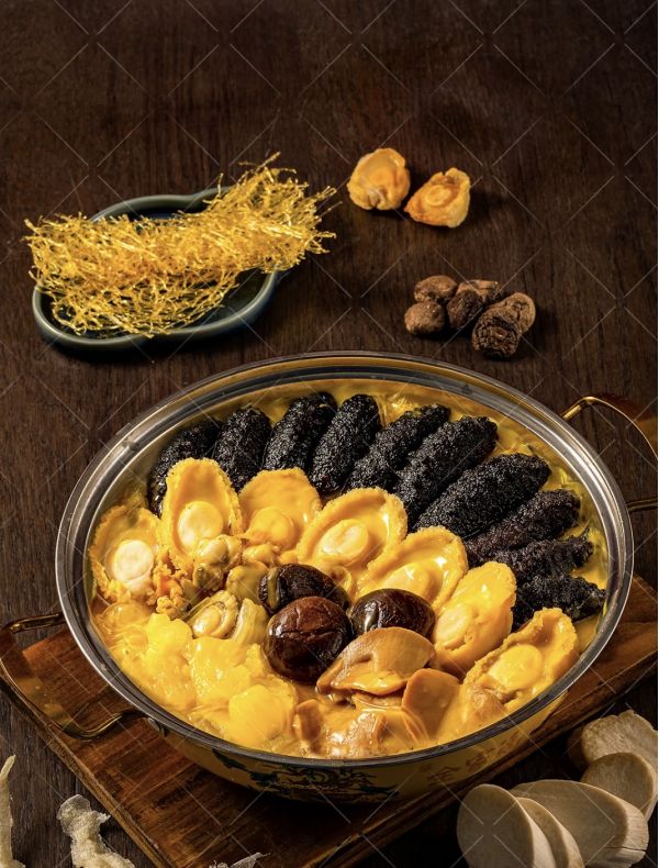 食材:選料精細,通常有鮑魚、海參、魚翅、干貝、魚唇等30多種原料,葷素搭配,包括肉、海鮮、冬菇、冬筍等。