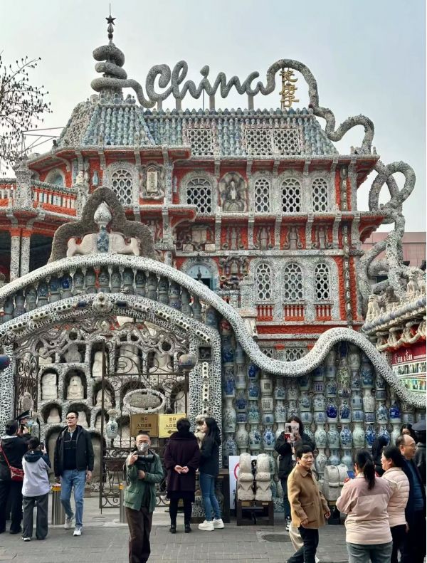 由635個民國和晚清時期的古瓷瓶壘砌串聯而成,“平”取諧音“瓶”而來,寓意平平安安,院墻呈波浪形曲線,契合瓷房子中西合璧的設計思想。