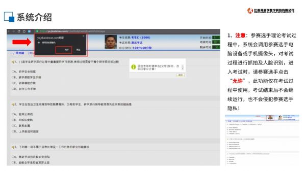 考試過程中系統會調用選手電腦或手機攝像頭,進入考試時請點擊“允許”,考試結束后系統將不會繼續監控。
