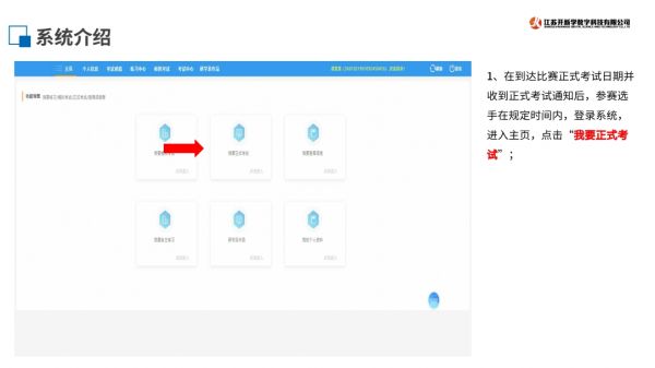 4.到理論考試日期并收到通知后,參賽選手在規定時間內登陸系統-進入主頁-點擊“我要正式考試”-選擇要參與的考試名稱-點擊“進入考場”并確認考試。