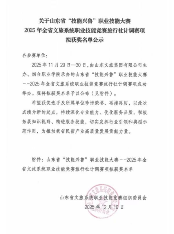 12月11日,山東省“技能興魯”職業(yè)技能大賽旅行社計(jì)調(diào)賽項(xiàng)獲獎名單正式發(fā)布。由聊城市精品旅游促進(jìn)會旅行社專委會會長劉寶平帶領(lǐng)的聊職院師生團(tuán)隊(duì),憑借扎實(shí)的專業(yè)功底與出色的實(shí)操能力在賽事中脫穎而出,一舉斬獲多項(xiàng)榮譽(yù)。